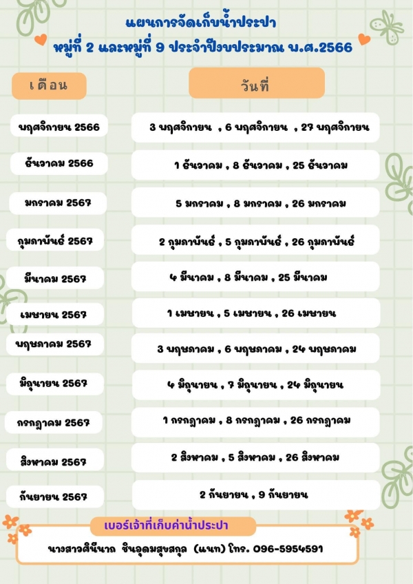 ประชาสัมพันธ์ แผนจัดเก็บค่าน้ำประปา และ ค่าขยะมูลฝอย หมู่ 2 และหมู่ที่ 9