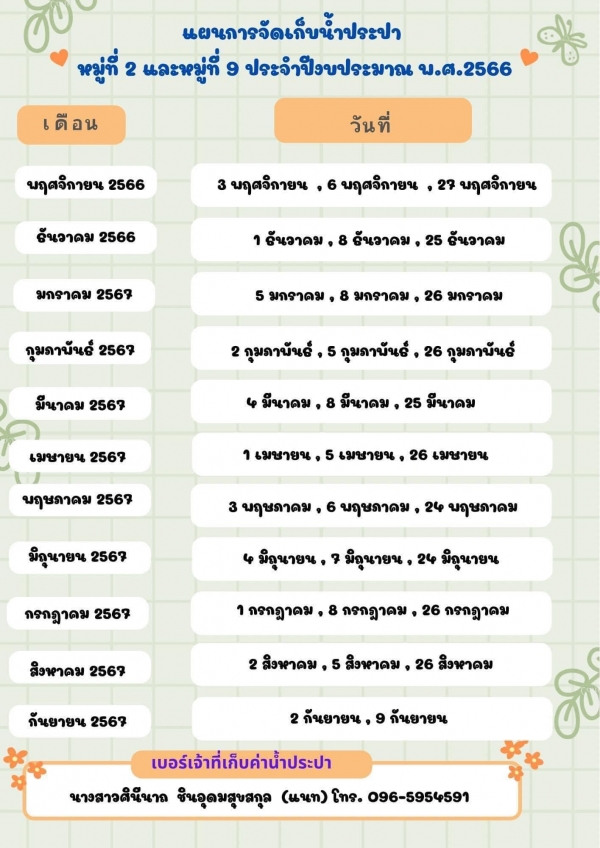 แผนจัดเก็บค่าน้ำประปา และ ค่าขยะมูลฝอย หมู่ 2 และหมู่ที่ 9 ประจำปีงบประมาณ พ.ศ.2567 ณ อาคารชั่วคราวหมู่ที่ 9 เวลา 09.00-15.30 น. เบอร์เจ้าหน้าที่เก็บค่าน้ำประปา นางสาวศินีนาถ ชินอุดมสุขสกุล (แนท) โทร.096-5954591 นายมรุพงศ์ พรภาวิต (มะ) โทร.080-02144