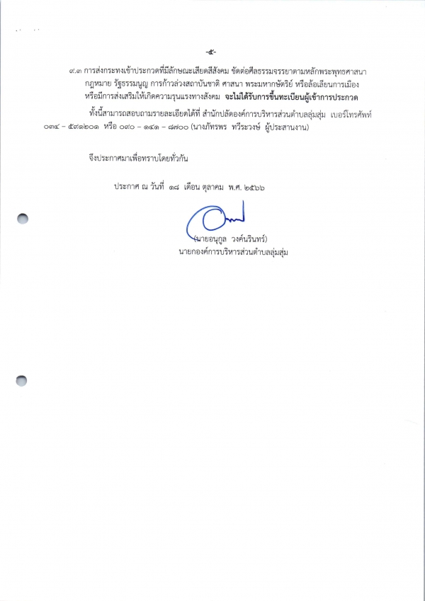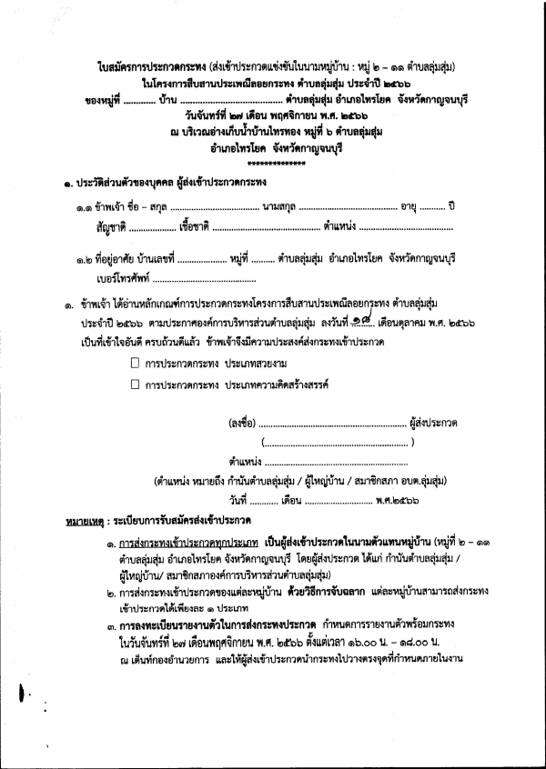 ประกาศองค์การบริหารส่วนตำบลลุ่มสุ่ม เรื่อง หลักการตัดสินประกวดกระทงตามโครงการสืบสานประลอยกระทง ตำบลลุ่มสุ่ม ประจำปี 2566 วันจันทร์ที่ 27 พฤศจิกายน พ.ศ. 2566 ณ บริเวณอ่างเก็บน้ำบ้านไทรทอง หมู่ที่ 6 ตำบลลุ่มสุ่ม อำเภอไทรโยค จังหวัดกาญจนบุรี