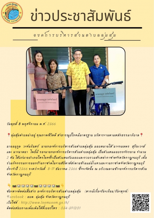 นายอนุกูล วงค์นรินทร์ นายกองค์การบริหารส่วนตำบลลุ่มสุ่ม มอบหมายให้ นางกมลพร สุริยะวงษ์ และ นางนาตยา โพธิ์มี รองนายกองค์การบริหารส่วนตำบลลุ่มสุ่ม เป็นตัวแทนมอบรถจักรยาน จำนวน 2 คัน ให้แก่นายอำเภอไทรโยค ซึ่งเป็นตัวแทนรับมอบและรวบรวมส่งเหล่ากาชาดจังหวัดกาญจนบุรี เพื่อร่วมกิจกรรมการออกร้านกาชาดในงานสัปดาห์สะพานข้ามแม่น้ำแควและงานกาชาดจังหวัดกาญจนบุรี ประจำปี 2566 ระหว่างวันที่ 8-17 ธันวาคม 2566 ซึ่งจะจัดขึ้น ณ บริเวณลานข้างองค์การบริหารส่วนจังหวัดกาญจนบุรี