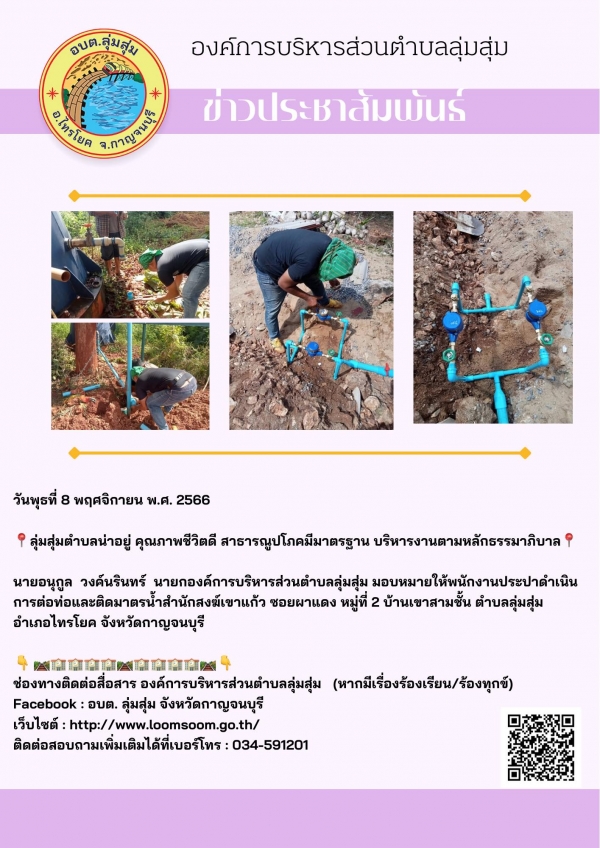 นายอนุกูล วงค์นรินทร์ นายกองค์การบริหารส่วนตำบลลุ่มสุ่ม มอบหมายให้พนักงานประปาดำเนินการต่อท่อและติดมาตรน้ำสำนักสงฆ์เขาแก้ว ซอยผาแดง หมู่ที่ 2 บ้านเขาสามชั้น ตำบลลุ่มสุ่ม อำเภอไทรโยค จังหวัดกาญจนบุรี