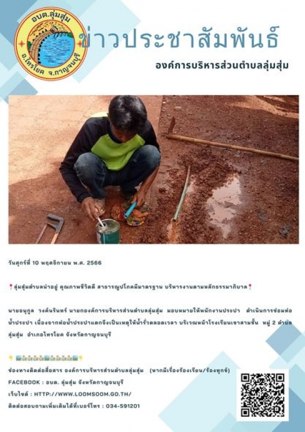 นายอนุกูล วงค์นรินทร์ นายกองค์การบริหารส่วนตำบลลุ่มสุ่ม มอบหมายให้พนักงานประปา ดำเนินการซ่อมท่อน้ำประปา เนื่องจากท่อน้ำประปาแตกจึงเป็นเหตุให้น้ำรั่วตลอดเวลา บริเวณหน้าโรงเรียนเขาสามชั้น หมู่ 2 ตำบลลุ่มสุ่ม อำเภอไทรโยค จังหวัดกาญจนบุรี