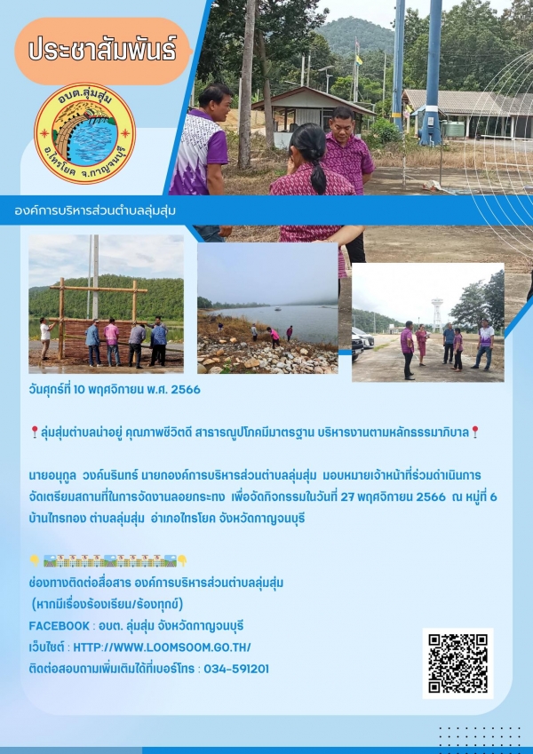นายอนุกูล วงค์นรินทร์ นายกองค์การบริหารส่วนตำบลลุ่มสุ่ม มอบหมายเจ้าหน้าที่ร่วมดำเนินการจัดเตรียมสถานที่ในการจัดงานลอยกระทง เพื่อจัดกิจกรรมในวันที่ 27 พฤศจิกายน 2566 ณ หมู่ที่ 6 บ้านไทรทอง ตำบลลุ่มสุ่ม อำเภอไทรโยค จังหวัดกาญจนบุรี
