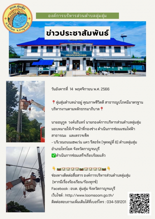 นายอนุกูล วงค์นรินทร์ นายกองค์การบริหารส่วนตำบลลุ่มสุ่ม มอบหมายให้เจ้าหน้าที่กองช่าง ดำเนินการซ่อมแซมไฟฟ้าสาธารณะ และตรวจเช็ค