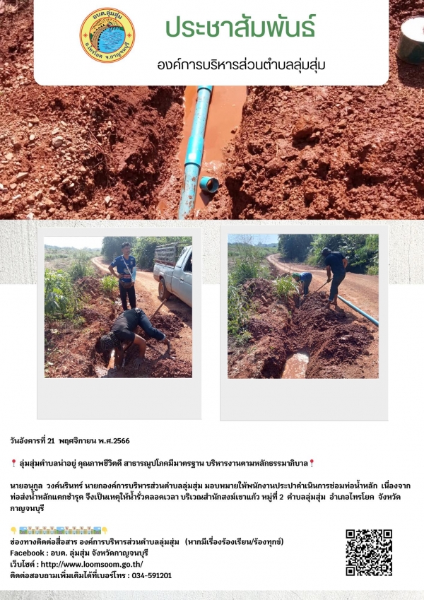 นายอนุกูล วงค์นรินทร์ นายกองค์การบริหารส่วนตำบลลุ่มสุ่ม มอบหมายให้พนักงานประปาดำเนินการซ่อมท่อน้ำหลัก เนื่องจากท่อส่งน้ำหลักแตกชำรุด จึงเป็นเหตุให้น้ำรั่วตลอดเวลา บริเวณสำนักสงฆ์เขาแก้ว หมู่ที่ 2 ตำบลลุ่มสุ่ม อำเภอไทรโยค จังหวัดกาญจนบุรี