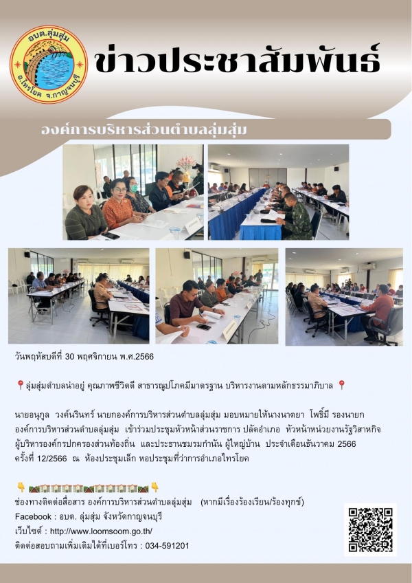 นายอนุกูล วงค์นรินทร์ นายกองค์การบริหารส่วนตำบลลุ่มสุ่ม มอบหมายให้นางนาตยา โพธิ์มี รองนายกองค์การบริหารส่วนตำบลลุ่มสุ่ม เข้าร่วมประชุมหัวหน้าส่วนราชการ ปลัดอำเภอ หัวหน้าหน่วยงานรัฐวิสาหกิจ ผู้บริหารองค์กรปกครองส่วนท้องถิ่น และประธานชมรมกำนัน ผู้ใหญ่บ้าน ประจำเดือนธันวาคม 2566 ครั้งที่ 12/2566 ณ ห้องประชุมเล็ก หอประชุมที่ว่าการอำเภอไทรโยค