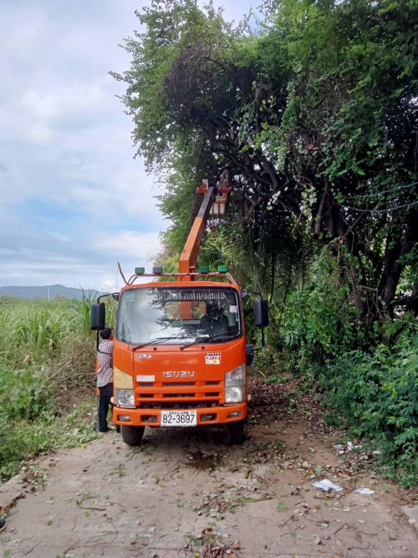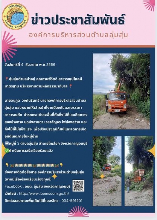 นายอนุกูล วงค์นรินทร์ นายกองค์การบริหารส่วนตำบลลุ่มสุ่ม มอบหมายให้เจ้าหน้าที่งานป้องกันและบรรเทาสาธารณภัย นำรถกระเช้าลงพื้นที่ตัดกิ่งไม้ที่เอนกีดขวางสองข้างทาง บดบังสายตา เวลาสัญจร ไฟส่องสว่าง และกิ่งไม้ที่ไม่แข็งแรง เพื่อปรับปรุงภูมิทัศน์และลดการเกิดอุบัติเหตุภายในหมู่บ้าน หมู่ที่ 3 ตำบลลุ่มสุ่ม อำเภอไทรโยค จังหวัดกาญจนบุรี ดำเนินการเสร็จเรียบร้อยแล้ว