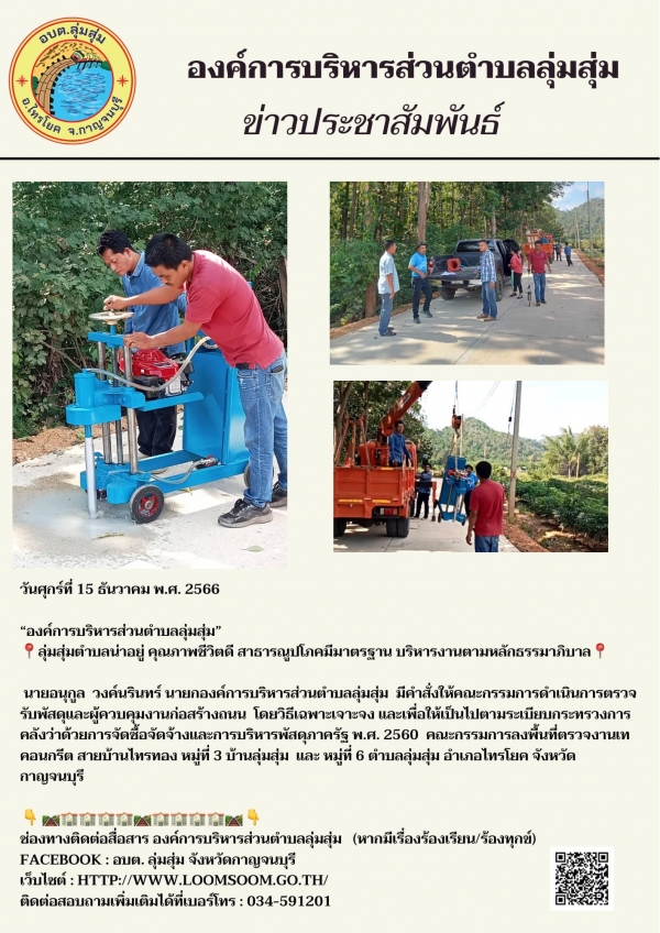 นายอนุกูล วงค์นรินทร์ นายกองค์การบริหารส่วนตำบลลุ่มสุ่ม มีคำสั่งให้คณะกรรมการดำเนินการตรวจรับพัสดุและผู้ควบคุมงานก่อสร้างถนน โดยวิธีเฉพาะเจาะจง และเพื่อให้เป็นไปตามระเบียบกระทรวงการคลังว่าด้วยการจัดซื้อจัดจ้างและการบริหารพัสดุภาครัฐ พ.ศ. 2560 คณะกรรมการลงพื้นที่ตรวจงานเทคอนกรีต สายบ้านไทรทอง หมู่ที่ 3 บ้านลุ่มสุ่ม และ หมู่ที่ 6 ตำบลลุ่มสุ่ม อำเภอไทรโยค จังหวัดกาญจนบุรี