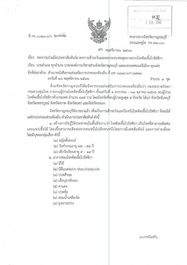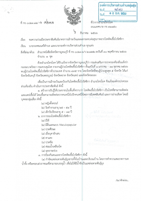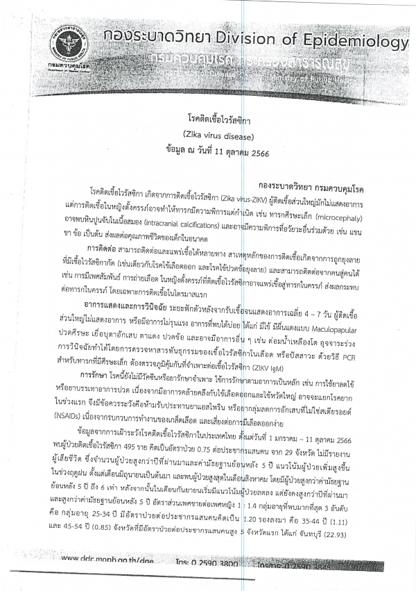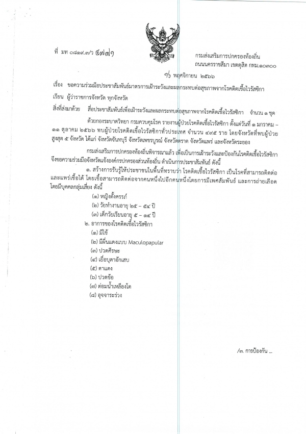 ขอความร่วมมือประชาสัมพันธ์มาตรการเฝ้าระวังและผลกระทบต่อสุขภาพจากโรคติดเชื้อไวรัสซิก้า