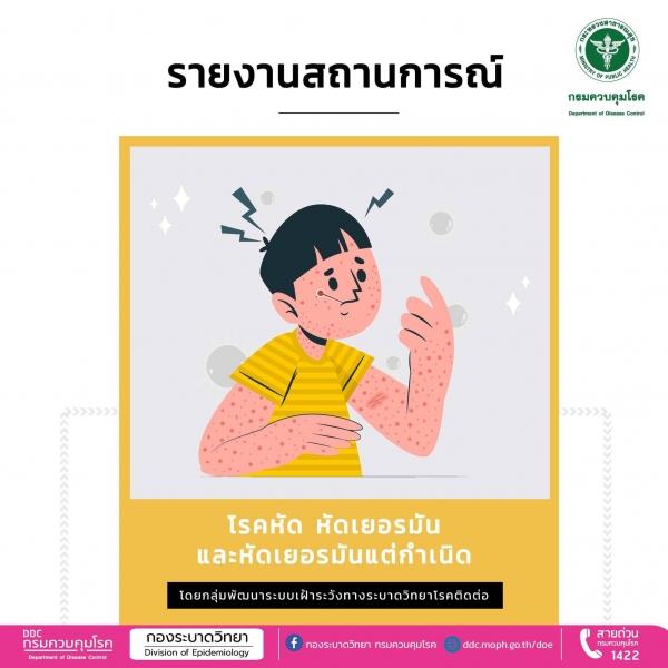 .อ่านรายงานสถานการณ์โรคหัด หัดเยอรมัน และหัดเยอรมันแต่กำเนิด วันที่ 1 มกราคม - 30 มิถุนายน 2566 (ข้อมูล ณ วันที่ 21 กรกฎาคม 2566) ได้ที่ : https://shorturl-ddc.moph.go.th/7CxWk