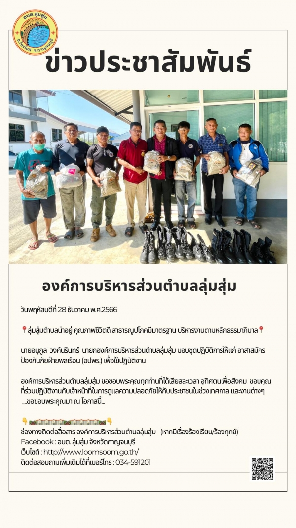 นายอนุกูล วงค์นรินทร์ นายกองค์การบริหารส่วนตำบลลุ่มสุ่ม มอบชุดปฏิบัติการให้แก่ อาสาสมัครป้องกันภัยฝ่ายพลเรือน (อปพร.) เพื่อใช้ปฏิบัติงาน องค์การบริหารส่วนตำบลลุ่มสุ่ม ขอขอบพระคุณทุกท่านที่ได้เสียสละเวลา อุทิศตนเพื่อสังคม ขอบคุณที่ร่วมปฏิบัติงานกับเจ้าหน้า