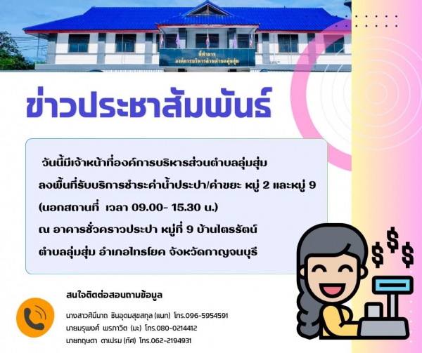 ประชาสัมพันธ์ ด้วยองค์การบริหารส่วนตำบลลุ่มสุ่ม วันนี้มีเจ้าหน้าที่ลงพื้นที่รับบริการ ชำระค่าน้ำประปา /ค่าขยะ หมู่ 2 และหมู่ 9 (นอกสถานที่ เวลา 09.00- 15.30 น.) ณ อาคารชั่วคราวประปา หมู่ที่ 9 บ้านไตรรัตน์ ตำบลลุ่มสุ่ม อำเภอไทรโยค จังหวัดกาญจนบุรี