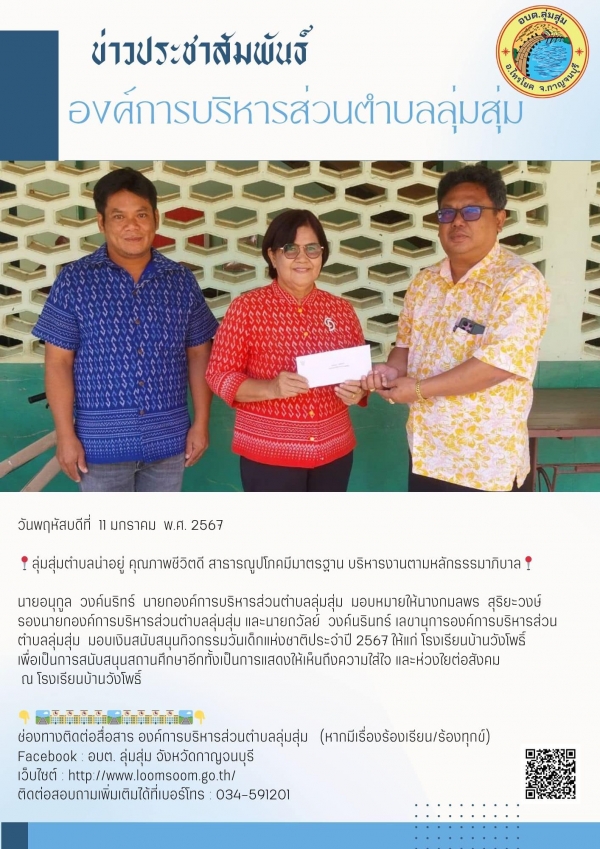 นายอนุกูล วงค์นริทร์ นายกองค์การบริหารส่วนตำบลลุ่มสุ่ม มอบหมายให้นางกมลพร สุริยะวงษ์ รองนายกองค์การบริหารส่วนตำบลลุ่มสุ่ม และนายถวัลย์ วงค์นรินทร์ เลขานุการองค์การบริหารส่วนตำบลลุ่มสุ่ม มอบเงินสนับสนุนกิจกรรมวันเด็กแห่งชาติ ประจำปี 2567 ให้แก่ โรงเรียนบ้า