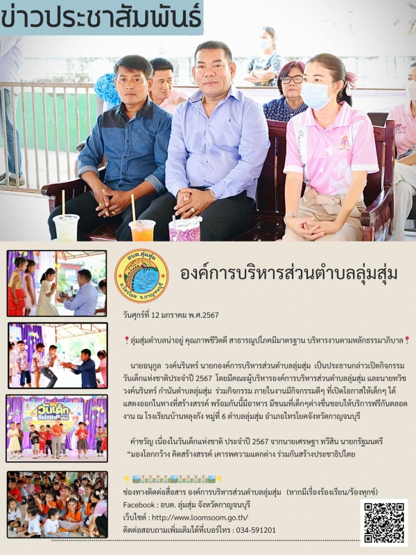 นายอนุกูล วงค์นรินทร์ นายกองค์การบริหารส่วนตำบลลุ่มสุ่ม เป็นประธานกล่าวเปิดกิจกรรมวันเด็กแห่งชาติ ประจำปี 2567 โดยมีคณะผู้บริหารองค์การบริหารส่วนตำบลลุ่มสุ่ม และนายทวิช วงค์นรินทร์ กำนันตำบลลุ่มสุ่ม ร่วมกิจกรรม ภายในงานมีกิจกรรมดีๆ ที่เปิดโอกาสให้เด็กๆ ได้แสดงออกในทางที่สร้างสรรค์ พร้อมกันนี้มีอาหาร มีขนมที่เด็กๆต่างชื่นชอบให้บริการฟรีกันตลอดงาน ณ โรงเรียนบ้านหลุงกัง หมู่ที่ 6 ตำบลลุ่มสุ่ม อำเภอไทรโยค จังหวัดกาญจนบุรี