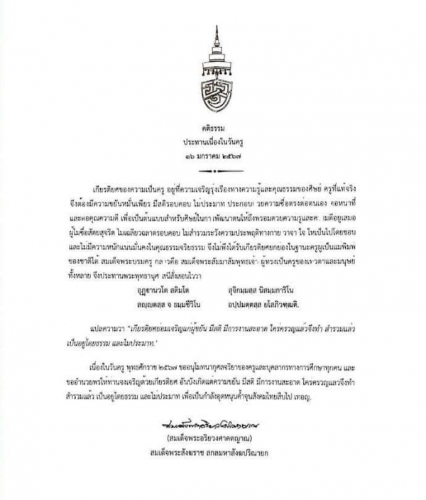 "คติธรรม" วันครู ปี 2567 สมเด็จพระอริยวงศาคตญาณ สมเด็จพระสังฆราช สกลมหาสังฆปริณายก ประธานเนื่องในวันครู 16 มกราคม 2567 "เกียรติยศย่อมเจริญแก่ผู้ขยัน มีสติ มีการงานสะอาด ใคร่ครวญแล้วจึงทำ สำรวมแล้ว เป็นอยู่โดยธรรม และไม่ประมาท"