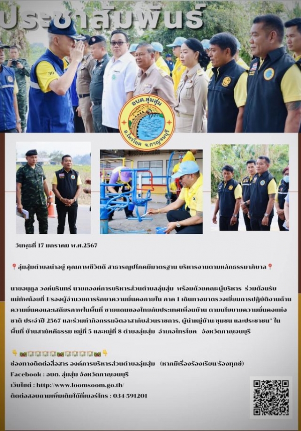 นายอนุกูล วงค์นรินทร์ นายกองค์การบริหารส่วนตำบลลุ่มสุ่ม พร้อมด้วยคณะผู้บริหาร ร่วมต้อนรับ แม่ทัพน้อยที่ 1/รองผู้อำนวยการรักษาความมั่นคงภายใน ภาค 1 เดินทางมาตรวจเยี่ยมการปฏิบัติงานด้านความมั่นคงและเสถียรภาพในพื้นที่ ชายแดนของไทยกับประเทศเพื่อนบ้าน ตามนโยบายความมั่นคงแห่งชาติ ประจำปี 2567 และร่วมทำกิจกรรมจิตอาสากับส่วนราชการ, ผู้นำหมู่บ้าน/ชุมชน และประชาชน" ในพื้นที่ บ้านสามัคคีธรรม หมู่ที่ 5 และหมู่ที่ 8 บ้านเสรีธรรม ตำบลลุ่มสุ่ม อำเภอไทรโยค จังหวัดกาญจนบุรี