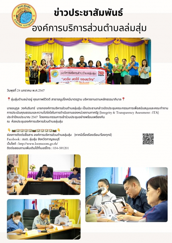 นายอนุกูล วงค์นรินทร์ นายกองค์การบริหารส่วนตำบลลุ่มสุ่ม เป็นประธานกล่าวเปิดประชุมคณะกรรมการเพื่อสนับสนุนและคณะทำงานการประเมินคุณธรรมและความโปร่งใสในการดำเนินงานของหน่วยงานภาครัฐ (Integrity & Transparency Assessment : ITA) ประจำปีงบประมาณ 2567 โดยคณะกรร