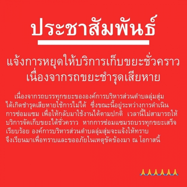 แจ้งการหยุดให้บริการเก็บขยะชั่วคราว เนื่องจากรถขยะชำรุดเสียหาย