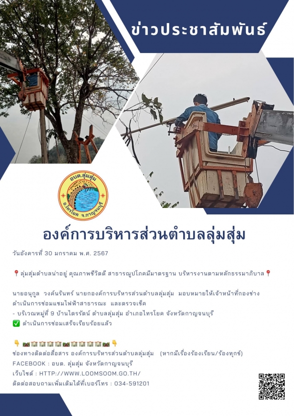 นายอนุกูล วงค์นรินทร์ นายกองค์การบริหารส่วนตำบลลุ่มสุ่ม มอบหมายให้เจ้าหน้าที่กองช่าง ดำเนินการซ่อมแซมไฟฟ้าสาธารณะ และตรวจเช็ค