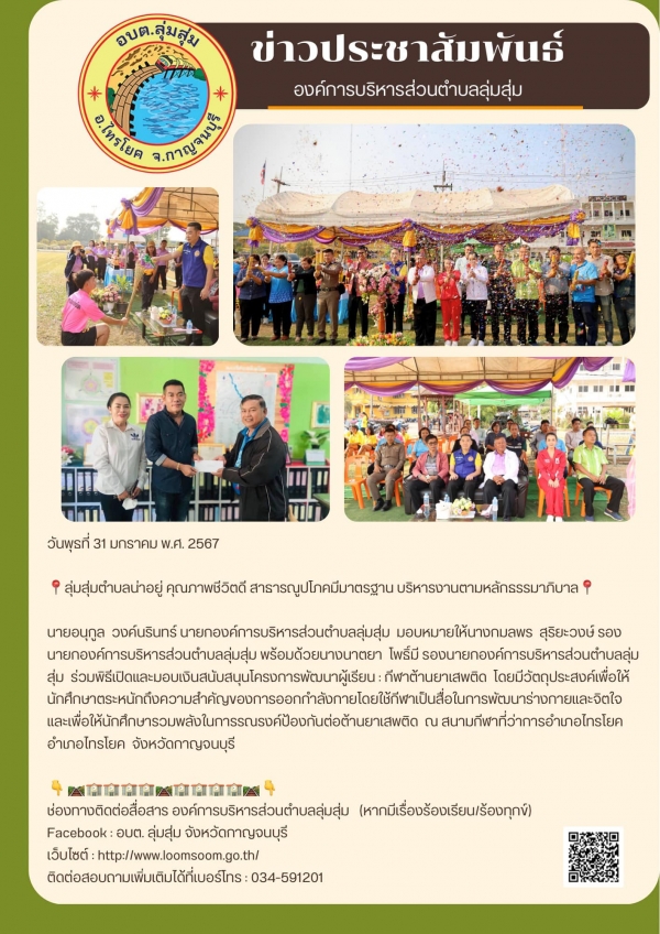 นายอนุกูล วงค์นรินทร์ นายกองค์การบริหารส่วนตำบลลุ่มสุ่ม มอบหมายให้นางกมลพร สุริยะวงษ์ รองนายกองค์การบริหารส่วนตำบลลุ่มสุ่ม พร้อมด้วยนางนาตยา โพธิ์มี รองนายกองค์การบริหารส่วนตำบลลุ่มสุ่ม ร่วมพิธีเปิดและสนับสนุนโครงการพัฒนาผู้เรียน : กีฬาต้านยาเสพติด โดยมีวัตถุประสงค์เพื่อให้นักศึกษาตระหนักถึงความสำคัญของการออกกำลังกายโดยใช้กีฬาเป็นสื่อในการพัฒนาร่างกายและจิตใจ และเพื่อให้นักศึกษารวมพลังในการรณรงค์ป้องกันต่อต้านยาเสพติด ณ สนามกีฬาที่ว่าการอำเภอไทรโยค อำเภอไทรโยค จังหวัดกาญจนบุรี