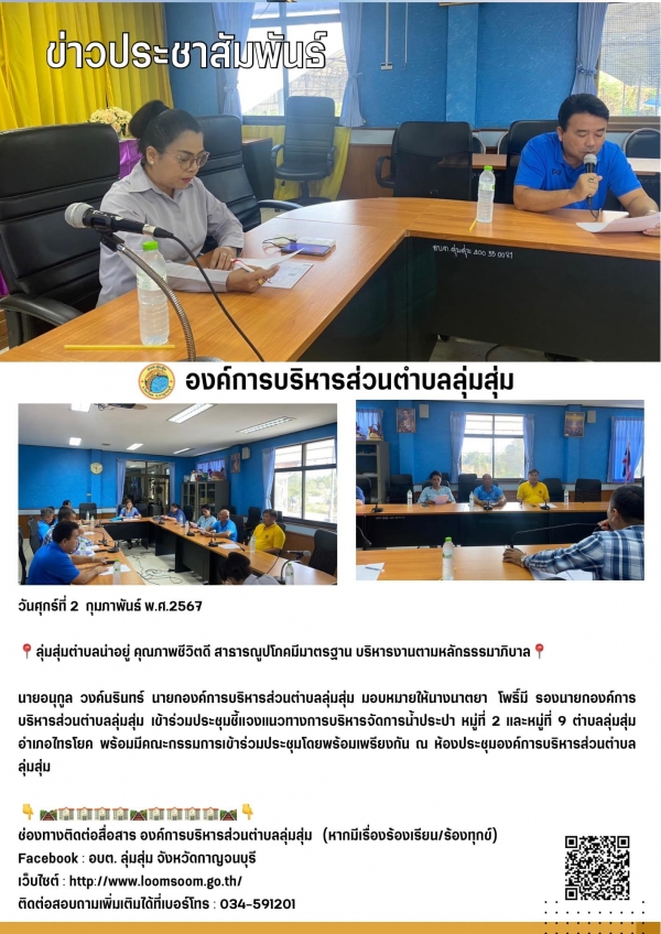นายอนุกูล วงค์นรินทร์ นายกองค์การบริหารส่วนตำบลลุ่มสุ่ม มอบหมายให้นางนาตยา โพธิ์มี รองนายกองค์การบริหารส่วนตำบลลุ่มสุ่ม เข้าร่วมประชุมชี้แจงแนวทางการบริหารจัดการน้ำประปา หมู่ที่ 2 และหมู่ที่ 9 ตำบลลุ่มสุ่ม อำเภอไทรโยค พร้อมมีคณะกรรมการเข้าร่วมประชุม