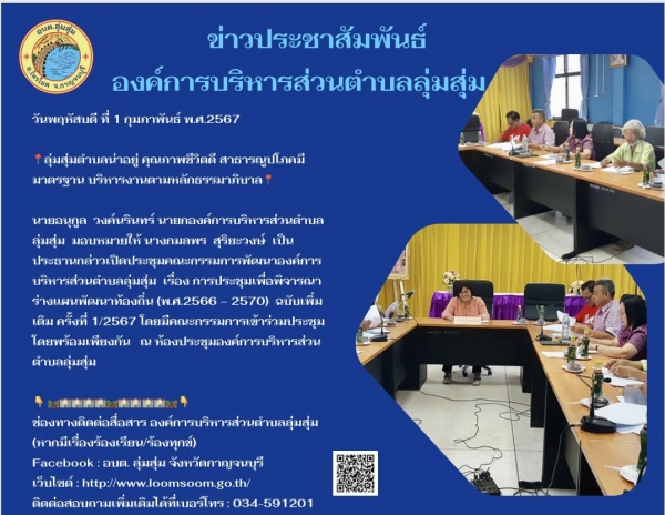 นายอนุกูล วงค์นรินทร์ นายกองค์การบริหารส่วนตำบลลุ่มสุ่ม มอบหมายให้ นางกมลพร สุริยะวงษ์ เป็นประธานกล่าวเปิดประชุมคณะกรรมการพัฒนาองค์การบริหารส่วนตำบลลุ่มสุ่ม เรื่อง การประชุมเพื่อพิจารณาร่างแผนพัฒนาท้องถิ่น (พ.ศ.2566 – 2570) ฉบับเพิ่มเติม ครั้งที่ 1/2567 โดยมีคณะกรรมการเข้าร่วมประชุมโดยพร้อมเพียงกัน