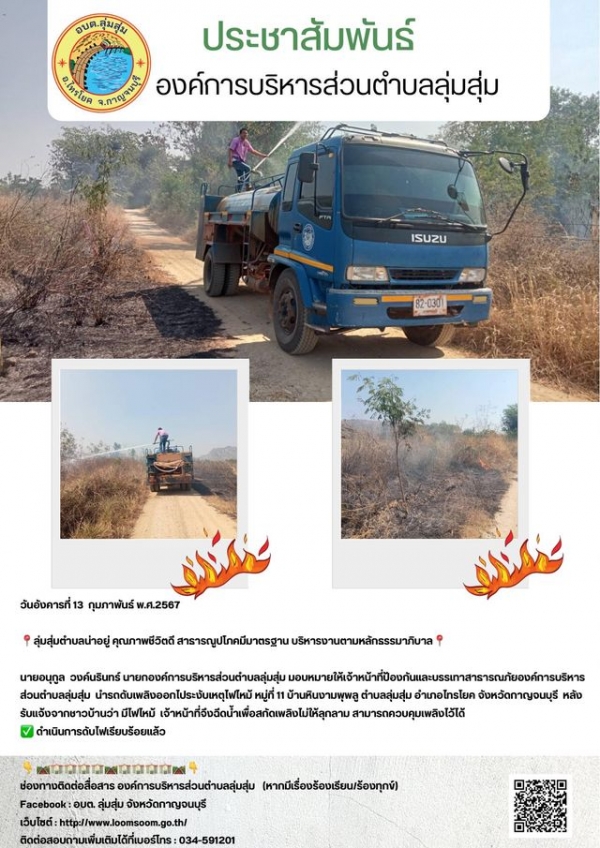 นายอนุกูล วงค์นรินทร์ นายกองค์การบริหารส่วนตำบลลุ่มสุ่ม มอบหมายให้เจ้าหน้าที่ป้องกันและบรรเทาสาธารณภัยองค์การบริหารส่วนตำบลลุ่มสุ่ม นำรถดับเพลิงออกไประงับเหตุไฟไหม้ หมู่ที่ 11 บ้านหินงามพุพลู ตำบลลุ่มสุ่ม อำเภอไทรโยค จังหวัดกาญจนบุรี หลังรับแจ้งจากชาวบ้านว่า มีไฟไหม้ เจ้าหน้าที่จึงฉีดน้ำเพื่อสกัดเพลิงไม่ให้ลุกลาม สามารถควบคุมเพลิงไว้ได้