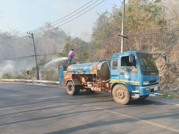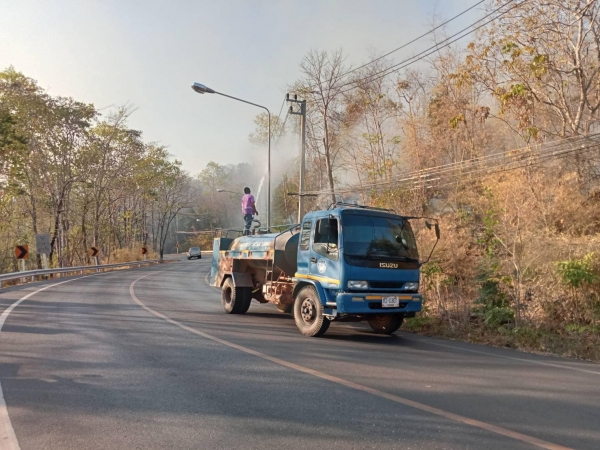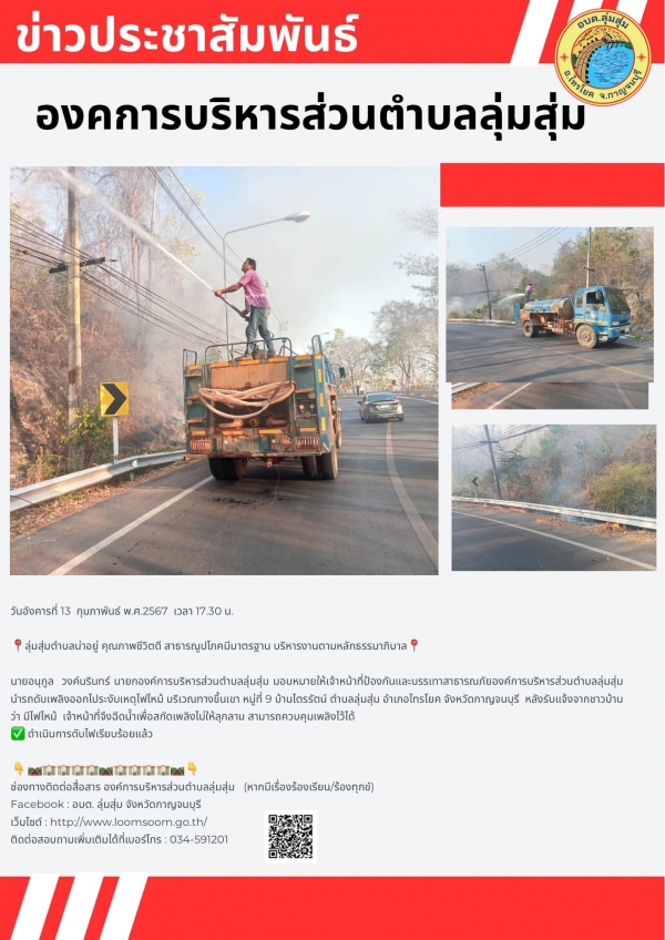 นายอนุกูล วงค์นรินทร์ นายกองค์การบริหารส่วนตำบลลุ่มสุ่ม มอบหมายให้เจ้าหน้าที่ป้องกันและบรรเทาสาธารณภัยองค์การบริหารส่วนตำบลลุ่มสุ่ม นำรถดับเพลิงออกไประงับเหตุไฟไหม้ บริเวณทางขึ้นเขา หมู่ที่ 9 บ้านไตรรัตน์ ตำบลลุ่มสุ่ม อำเภอไทรโยค จังหวัดกาญจนบุรี หลังร