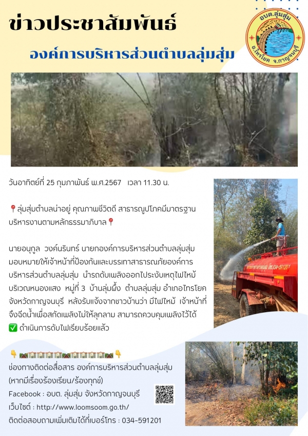 นายอนุกูล วงค์นรินทร์ นายกองค์การบริหารส่วนตำบลลุ่มสุ่ม มอบหมายให้เจ้าหน้าที่ป้องกันและบรรเทาสาธารณภัยองค์การบริหารส่วนตำบลลุ่มสุ่ม นำรถดับเพลิงออกไประงับเหตุไฟไหม้บริเวณหนองแสง หมู่ที่ 3 บ้านลุ่มผึ้ง ตำบลลุ่มสุ่ม อำเภอไทรโยค จังหวัดกาญจนบุรี หลังรั