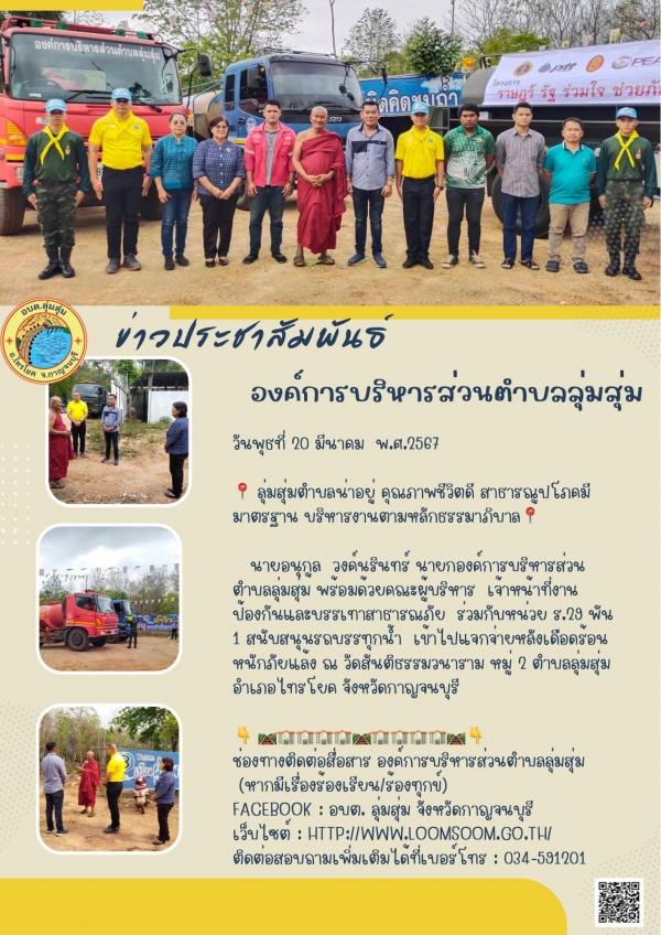 นายอนุกูล วงค์นรินทร์ นายกองค์การบริหารส่วนตำบลลุ่มสุ่ม พร้อมด้วยคณะผู้บริหาร เจ้าหน้าที่งานป้องกันและบรรเทาสาธารณภัย ร่วมกับหน่วย ร.29 พัน 1 สนับสนุนรถบรรทุกน้ำ เข้าไปแจกจ่ายหลังเดือดร้อนหนักภัยแล้ง ณ วัดสันติธรรมวนาราม หมู่ 2 ตำบลลุ่มสุ่ม อำเภอไทรโยค จังหวัดกาญจนบุรี