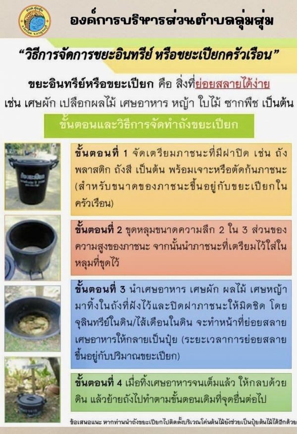 3) นำเศษอาหาร เศษผัก มาทิ้งในถัง และปิดฝามิดชิด 4) เมื่อทิ้งจนเต็ม ให้กลบแล้วย้ายถังไปจุดอื่น