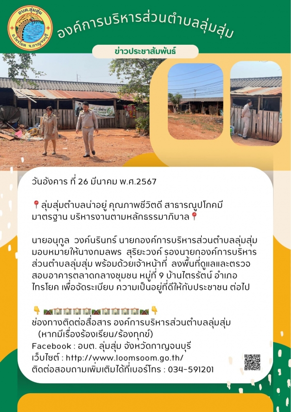 นายอนุกูล วงค์นรินทร์ นายกองค์การบริหารส่วนตำบลลุ่มสุ่ม มอบหมายให้นางกมลพร สุริยะวงค์ รองนายกองค์การบริหารส่วนตำบลลุ่มสุ่ม พร้อมด้วยเจ้าหน้าที่ ลงพื้นที่ดูแลและตรวจสอบอาคารตลาดกลางชุมชน หมู่ที่ 9 บ้านไตรรัตน์ อำเภอไทรโยค เพื่อจัดระเบียบ ความเป็นอยู่ที่