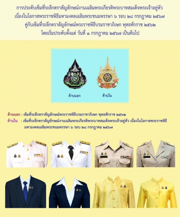 การประดับเข็มที่ระลึกตราสัญลักษณ์งานเฉลิมพระเกียรติพระบาทสมเด็จพระเจ้าอยู่หัว เนื่องในโอกาสพระราชพิธีมหามงคลเฉลิมพระชนมพรรษา ๖ รอบ ๒๘ กรกฎาคม ๒๕๖๗ คู่กับเข็มที่ระลึกตราสัญลักษณ์พระราชพิธีบรมราชาภิเษก พุทธศักราช ๒๕๖๒ โดยเริ่มประดับตั้งแต่ วันที่ ๑ กรกฏาคม ๒๕๖๗ เป็นต้นไป