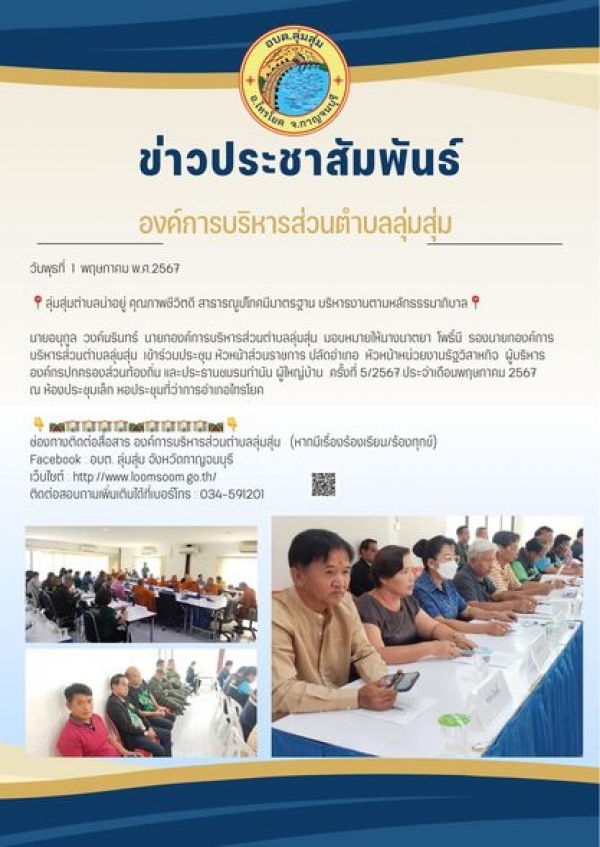 นายอนุกูล วงค์นรินทร์ นายกองค์การบริหารส่วนตำบลลุ่มสุ่ม มอบหมายให้นางนาตยา โพธิ์มี รองนายกองค์การบริหารส่วนตำบลลุ่มสุ่ม เข้าร่วมประชุม หัวหน้าส่วนราชการ ปลัดอำเภอหัวหน้าหน่วยงานรัฐวิสาหกิจ ผู้บริหารองค์กรปกครองส่วนท้องถิ่น และประธานชมรมกำนัน ผู้ใหญ่บ้าน ครั้งที่ 5/2567 ประจำเดือนพฤษภาคม 2567 ณ ห้องประชุมเล็ก หอประชุมที่ว่าการอำเภอไทรโยค