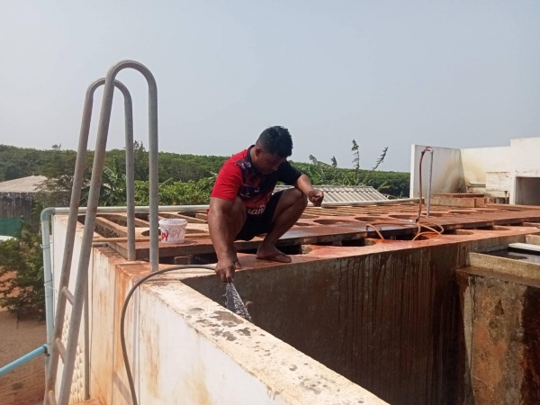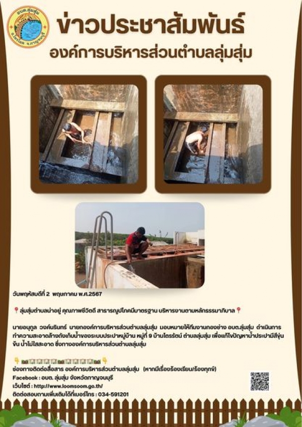 นายอนุกูล วงค์นรินทร์ นายกองค์การบริหารส่วนตำบลลุ่มสุ่ม มอบหมายให้ทีมงานกองช่าง อบต.ลุ่มสุ่ม ดำเนินการทำความสะอาดล้างถังเก็บน้ำของระบบประปาหมู่บ้าน หมู่ที่ 9 บ้านไตรรัตน์ ตำบลลุ่มสุ่ม เพื่อแก้ไขปัญหาน้ำประปามีสีขุ่นข้น น้ำไม่ใสสะอาด ซึ่งทางองค์การบริห