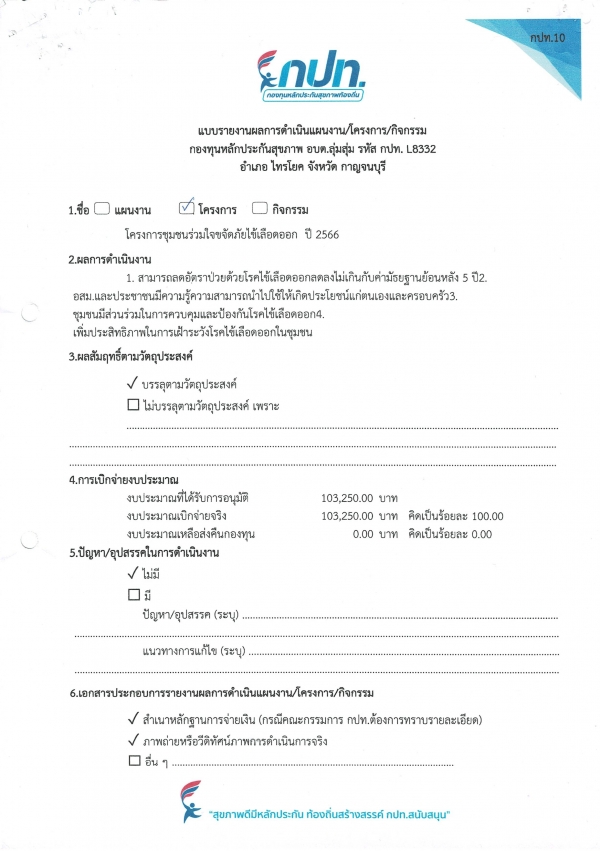 แบบรายงานผลการดำเนินแผนงาน โครงการชุมชนร่วมใจขจัดภัยไข้เลือดออก ปี 2566