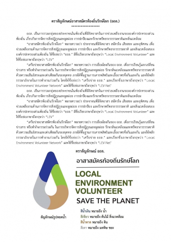 “อาสาสมัครท้องถิ่นรักษ์โลก” หมายความว่า ประชาชนที่มีจิตอาสา สมัครใจ เสียสละ และอุทิศตน เพื่อช่วยเหลืองานด้านการจัดการสิ่งปฏิกูลและมูลฝอย การปกป้อง และรักษาทรัพยากรธรรมชาติ และสิ่งแวดล้อมขององค์กรปกครองส่วนท้องถิ่น ใช้ชื่อย่อว่า “อถล.” มีชื่อเรียกภาษาอังกฤษว่า “Local Environment Volunteer” และใช้ชื่อย่อภาษาอังกฤษว่า “LEV”