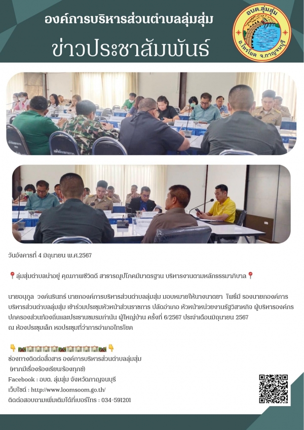 นายอนุกูล วงค์นรินทร์ นายกองค์การบริหารส่วนตำบลลุ่มสุ่ม มอบหมายให้นางนาตยา โพธิ์มี รองนายกองค์การบริหารส่วนตำบลลุ่มสุ่ม เข้าร่วมประชุมหัวหน้าส่วนราชการ ปลัดอำเภอ หัวหน้าหน่วยงานรัฐวิสาหกิจ ผู้บริหารองค์กรปกครองส่วนท้องถิ่นและประธานชมรมกำนัน ผู้ใหญ่บ้าน ครั้งที่ 6/2567 ประจำเดือนมิถุนายน 2567 ณ ห้องประชุมเล็ก หอประชุมที่ว่าการอำเภอไทรโยค
