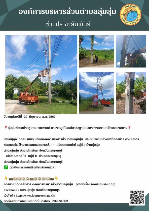 นายอนุกูล วงค์นรินทร์ นายกองค์การบริหารส่วนตำบลลุ่มสุ่ม มอบหมายให้เจ้าหน้าที่กองช่าง ดำเนินการซ่อมแซมไฟฟ้าสาธารณะและตรวจเช็ค - เปลี่ยนหลอดไฟ หมู่ที่ 3 บ้านลุ่มสุ่ม ตำบลลุ่มสุ่ม อำเภอไทรโยค จังหวัดกาญจนบุรี - เปลี่ยนหลอดไฟ หมู่ที่ 11 บ้านหินงามพุพลู ต