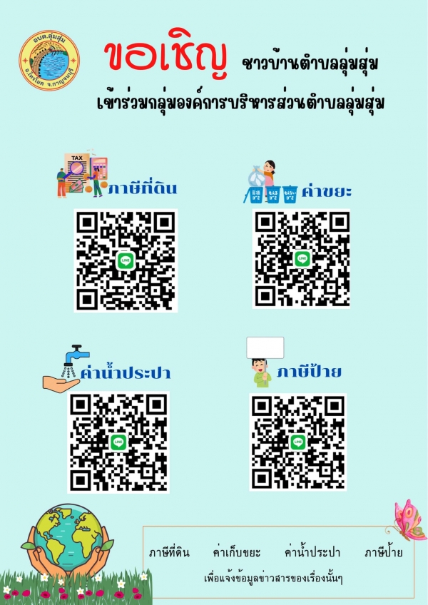 ประชาสัมพันธ์ ขอเชิญ ชาวบ้านตำบลลุ่มสุ่ม เข้าร่วมกลุ่มงานบริการด้านภาษีที่ดิน , ค่าขยะ , ค่าน้ำประปา , ภาษีป้าย ขององค์การบริหารส่วนตำบลลุ่มสุ่ม เพื่อรับข้อมูลข่าวสาร