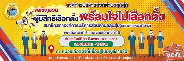 ประชาสัมพันธ์ องค์การบริหารส่วนตำบลลุ่มสุ่ม ขอเชิญชวน ผู้มีสิทธิ์เลือกตั้ง พร้อมใจไปเลือกตั้ง สมาชิกสภาองค์การบริหารส่วนตำบลลุ่มสุ่ม (แทนตำแหน่งที่ว่าง) เขตเลือกตั้งที่ 6 และเขตเลือกตั้งที่ 10 ในวันอาทิตย์ที่ 11 สิงหาคม พ.ศ. 2567 เวลา 08:00น.- 17:00 น. ณ