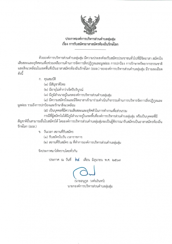 ประกาศองค์การบริหารส่วนตำบลลุ่มสุ่ม เรื่อง การรับสมัครอาสาสมัครท้องถิ่นรักษ์โลก