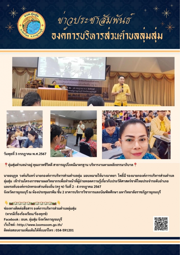 นายอนุกูล วงค์นรินทร์ นายกองค์การบริหารส่วนตำบลลุ่ม มอบหมายให้นางนาตยา โพธิ์มี รองนายกองค์การบริหารส่วนตำบลลุ่มสุ่ม เข้าร่วมโครงการขยายผลวิทยากรเพื่อทำหน้าที่ผู้ถ่ายทอดความรู้เกี่ยวกับประวัติศาสตร์ชาติไทยประจำระดับอำเภอ และระดับองค์กรปกครองส่วนท้องถิ่น (ครู ข) วันที่ 2 - 4 กรกฎาคม 2567 จังหวัดกาญจนบุรี ณ ห้องประชุมอรพิม ชั้น 2 อาคารบริการวิชาการและบัณฑิตศึกษา มหาวิทยาลัยราชภัฏกาญจนบุรี