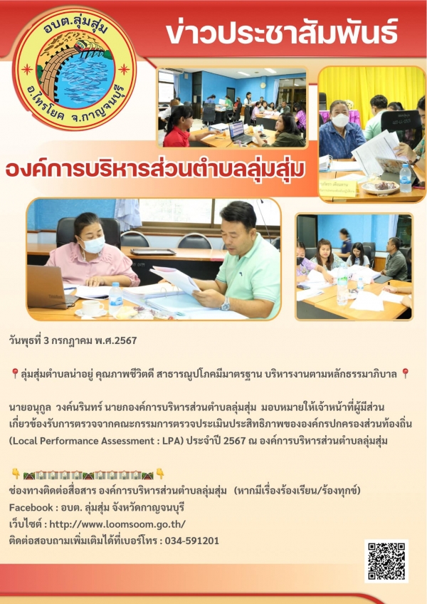 นายอนุกูล วงค์นรินทร์ นายกองค์การบริหารส่วนตำบลลุ่มสุ่ม มอบหมายให้เจ้าหน้าที่ผู้มีส่วนเกี่ยวข้องรับการตรวจจากคณะกรรมการตรวจประเมินประสิทธิภาพขององค์กรปกครองส่วนท้องถิ่น (Local Performance Assessment : LPA) ประจำปี 2567 ณ องค์การบริหารส่วนตำบลลุ่มสุ่ม