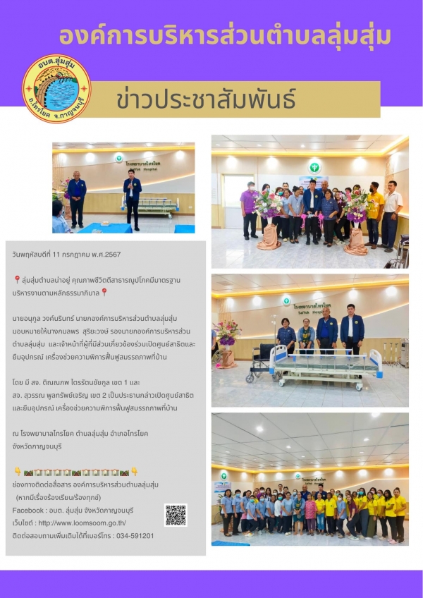 นายอนุกูล วงค์นรินทร์ นายกองค์การบริหารส่วนตำบลลุุ่มสุ่ม มอบหมายให้นางกมลพร สุริยะวงษ์ รองนายกองค์การบริหารส่วนตำบลลุ่มสุ่ม และเจ้าหน้าที่ผู้ที่มีส่วนเกี่ยวข้องร่วมเปิดศูนย์สาธิตและยืมอุปกรณ์ เครื่องช่วยความพิการฟื้นฟูสมรรถภาพที่บ้าน โดย มี สจ. ติณณภพ