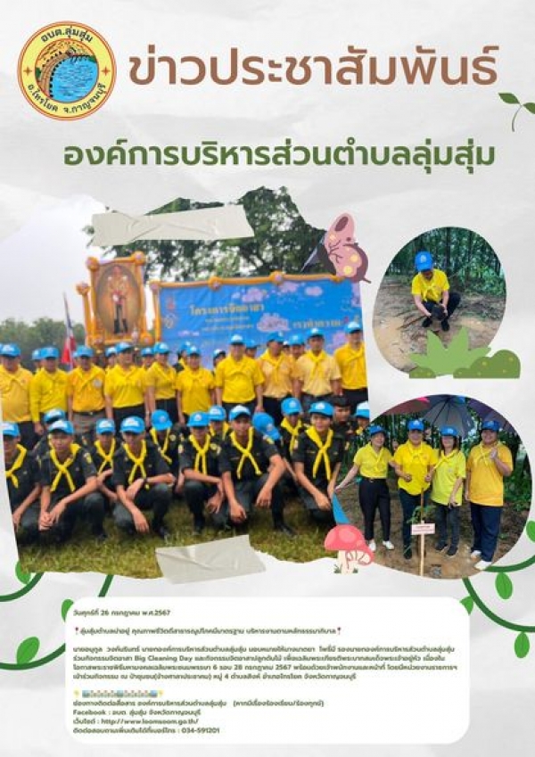 นายอนุกูล วงค์นรินทร์ นายกองค์การบริหารส่วนตำบลลุ่มสุ่ม มอบหมายให้นางนาตยา โพธิ์มี รองนายกองค์การบริหารส่วนตำบลลุ่มสุ่ม ร่วมกิจกรรมจิตอาสา Big Cleaning Day และกิจกรรมจิตอาสาปลูกต้นไม้ เพื่อเฉลิมพระเกียรติพระบาทสมเด็จพระเจ้าอยู่หัว เนื่องในโอกาสพระราชพิธีมหามงคลเฉลิมพระชนมพรรษา 6 รอบ 28 กรกฎาคม 2567 พร้อมด้วยเจ้าพนักงานและหน้าที่ โดยมีหน่วยงานราชการฯ เข้าร่วมกิจกรรม ณ ป่าชุมชน(ข้างศาลาประชาคม) หมู่ 4 ตำบลสิงห์ อำเภอไทรโยค จังหวัดกาญจนบุรี