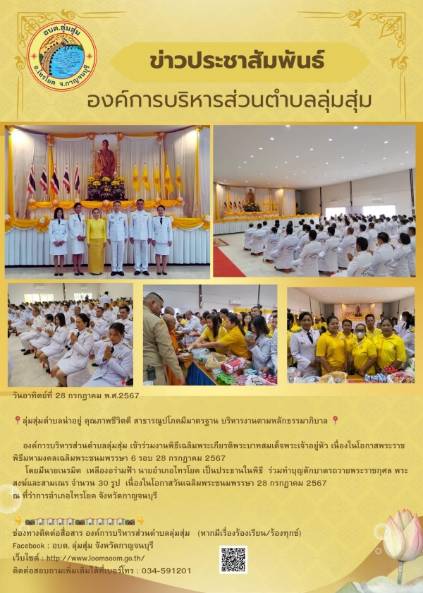 องค์การบริหารส่วนตำบลลุ่มสุ่ม เข้าร่วมงานพิธีเฉลิมพระเกียรติพระบาทสมเด็จพระเจ้าอยู่หัว เนื่องในโอกาสพระราชพิธีมหามงคลเฉลิมพระชนมพรรษา 6 รอบ 28 กรกฎาคม 2567 โดยมีนายเนรมิต เหลืองอร่ามฟ้า นายอำเภอไทรโยค เป็นประธานในพิธี ร่วมทำบุญตักบาตรถวายพระรา