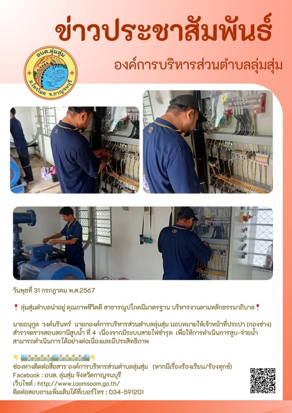 นายอนุกูล วงค์นรินทร์ นายกองค์การบริหารส่วนตำบลลุ่มสุ่ม มอบหมายให้เจ้าหน้าที่ประปา (กองช่าง) สำรวจตรวจสอบสถานีสูบน้ำ ที่ 4 เนื่องจากมีระบบสายไฟชำรุด เพื่อให้การดำเนินการสูบ-จ่ายน้ำ สามารถดำเนินการได้อย่างต่อเนื่องและมีประสิทธิภาพ