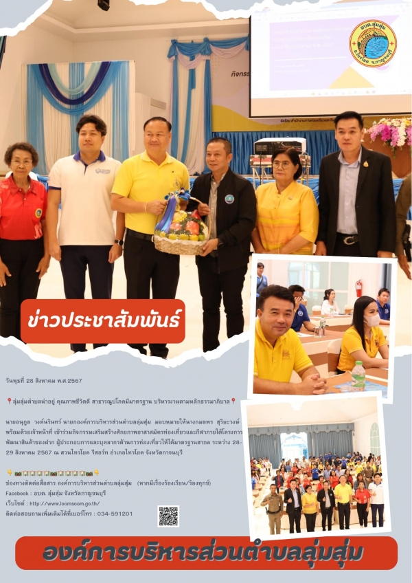 นายอนุกูล วงค์นรินทร์ นายกองค์การบริหารส่วนตำบลลุ่มสุ่ม มอบหมายให้นางกมลพร สุริยะวงษ์ พร้อมด้วยเจ้าหน้าที่ เข้าร่วมกิจกรรมเสริมสร้างศักยภาพอาสาสมัครท่องเที่ยวและกีฬาภายใต้โครงการพัฒนาสินค้าของฝาก ผู้ประกอบการและบุคลากรด้านการท่องเที่ยวให้ได้มาตรฐานสากล ระหว่าง 28-29 สิงหาคม 2567 ณ สวนไทรโยค รีสอร์ท อำเภอไทรโยค จังหวัดกาจนบุรี