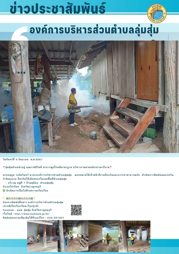 นายอนุกูล วงค์นรินทร์ นายกองค์การบริหารส่วนตำบลลุ่มสุ่ม มอบหมายให้เจ้าหน้าที่งานป้องกันและบรรเทาสาธารณภัย ดำเนินการฉีดพ่นหมอกควัน กำจัดยุงลาย ป้องกันไข้เลือดออกในเขตพื้นที่ตำบลลุ่มสุ่ม - บริเวณ หมู่ที่ 7 บ้านพุน้อย ตำบลลุ่มสุ่ม อำเภอไทรโยค จังหวั